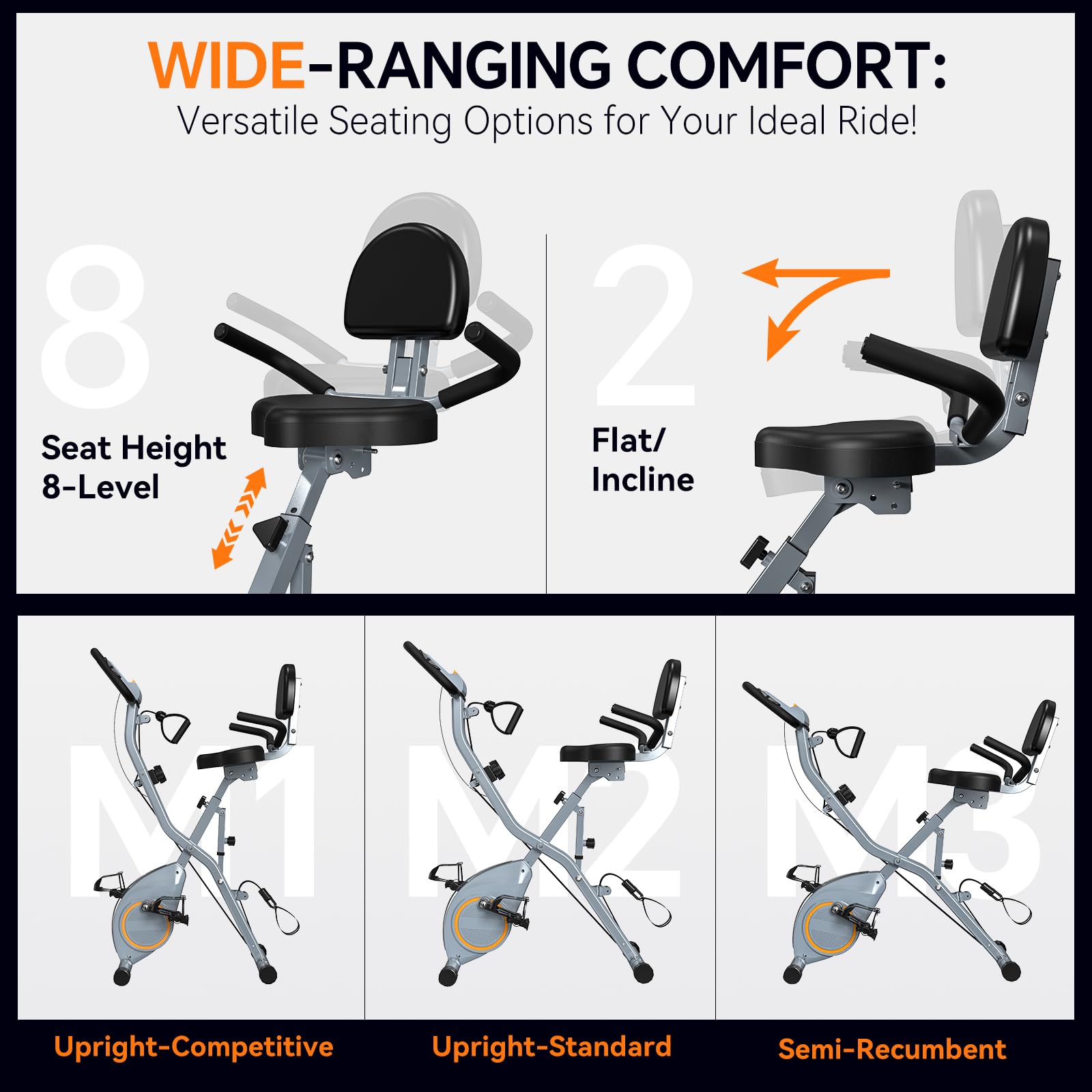 - SAVE SPACE & MOVE EASILY: The portable bike is easily adjustable, allowing for quick folding and upright. Its design enables easy storage in a small area, making it an ideal choice for small apartments or offices. The foldable bike comes with rollers on the front feet, facilitating effortless movement. Whether you're aiming to save space or seeking a portable exercise option, this workout bike for home gym is the ideal solution.